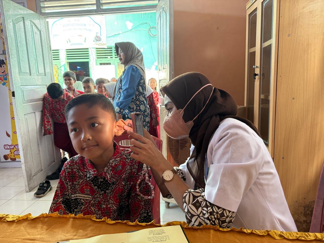 Suasana hangat terasa ketika petugas medis tak hanya melakukan pemeriksaan, tetapi juga mengedukasi siswa dengan cara sederhana dan menyenangkan, mulai dari cara mencuci tangan dengan benar hingga menjaga pola makan sehat.
