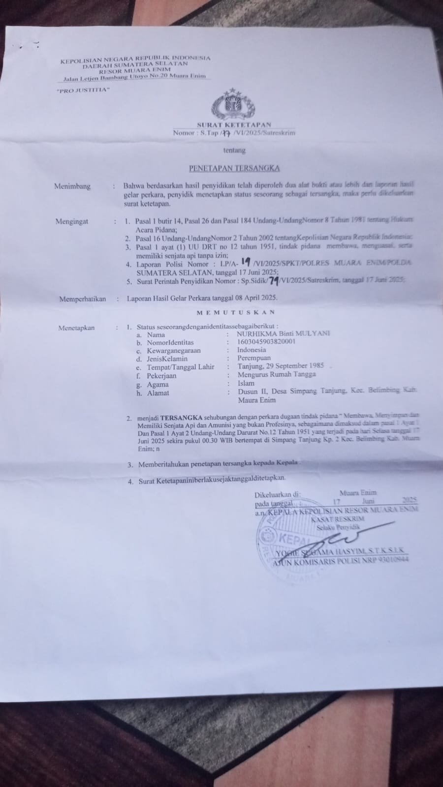 Advokat Desri Nago, S.H. menyampaikan bahwa langkah hukum ini diambil demi kepentingan kliennya yang diduga mengalami perlakuan tidak sesuai prosedur hukum. Menurutnya, peristiwa terjadi pada tanggal 17 malam sekitar pukul 02.00 WIB, ketika sekelompok orang yang diduga merupakan anggota Polres Muara Enim mendatangi rumah Nurhikma.