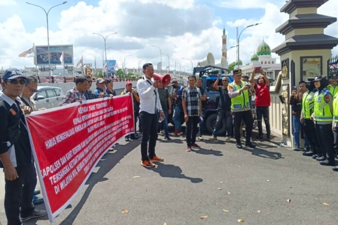 Sumsel.Goutara.com, Palembang – Lembaga Pemerhati Organsiasi Sosial dan Ekonomi Republik Indonesia (POSE RI) kembali menggelar aksi unjuk rasa besar-besaran di depan Markas Polda Sumatera Selatan, Rabu (1/10). Aksi ini merupakan bentuk protes keras terhadap dugaan pembiaran aktivitas pengeboran dan penyulingan minyak ilegal oleh Polsek Keluang, yang dinilai telah menyebabkan serangkaian kebakaran sumur minyak dan mengancam keselamatan masyarakat.