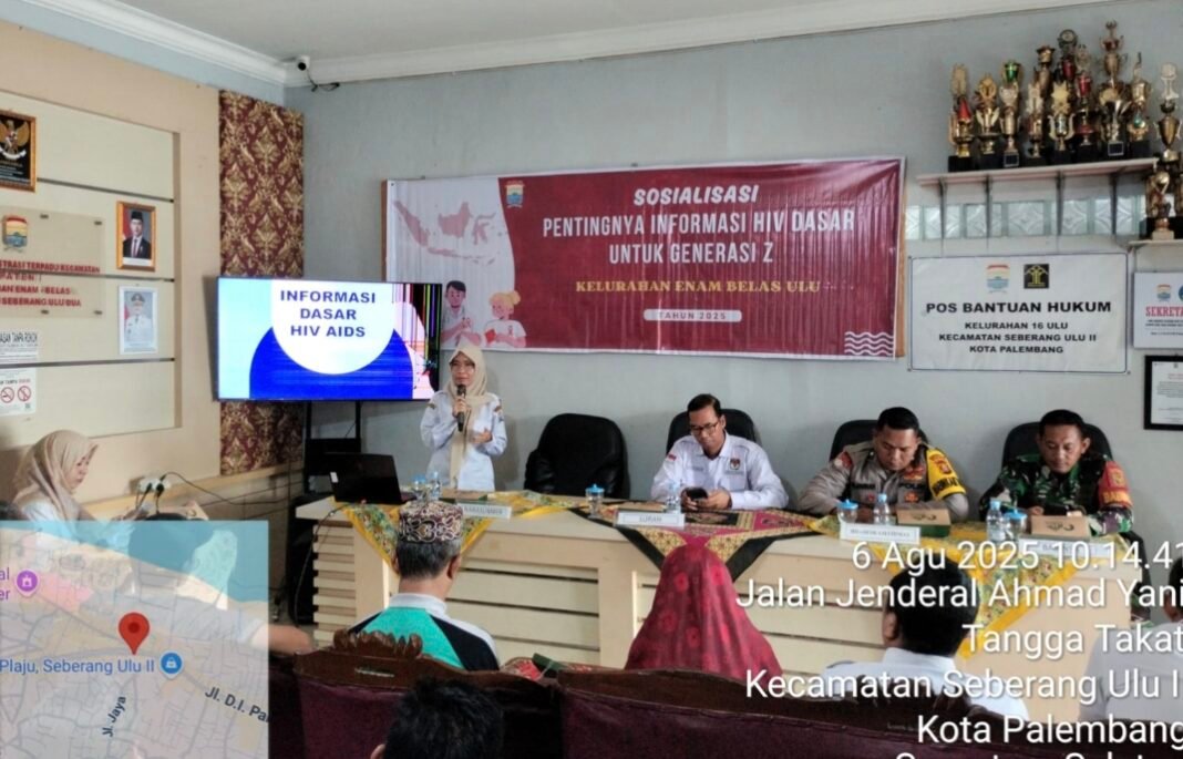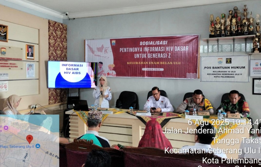 Sumsel.Goutara.com, Palembang – Lurah Enam Belas Ulu, Kgs. Syahri Ramadhon, menghadiri Sosialisasi Pentingnya Informasi HIV Dasar bagi Generasi Z yang digelar di Kantor Kelurahan 16 Ulu, Rabu (06/08). Kegiatan ini bertujuan untuk memberikan pemahaman kepada remaja tentang bahaya HIV/AIDS dan bagaimana cara penularannya.